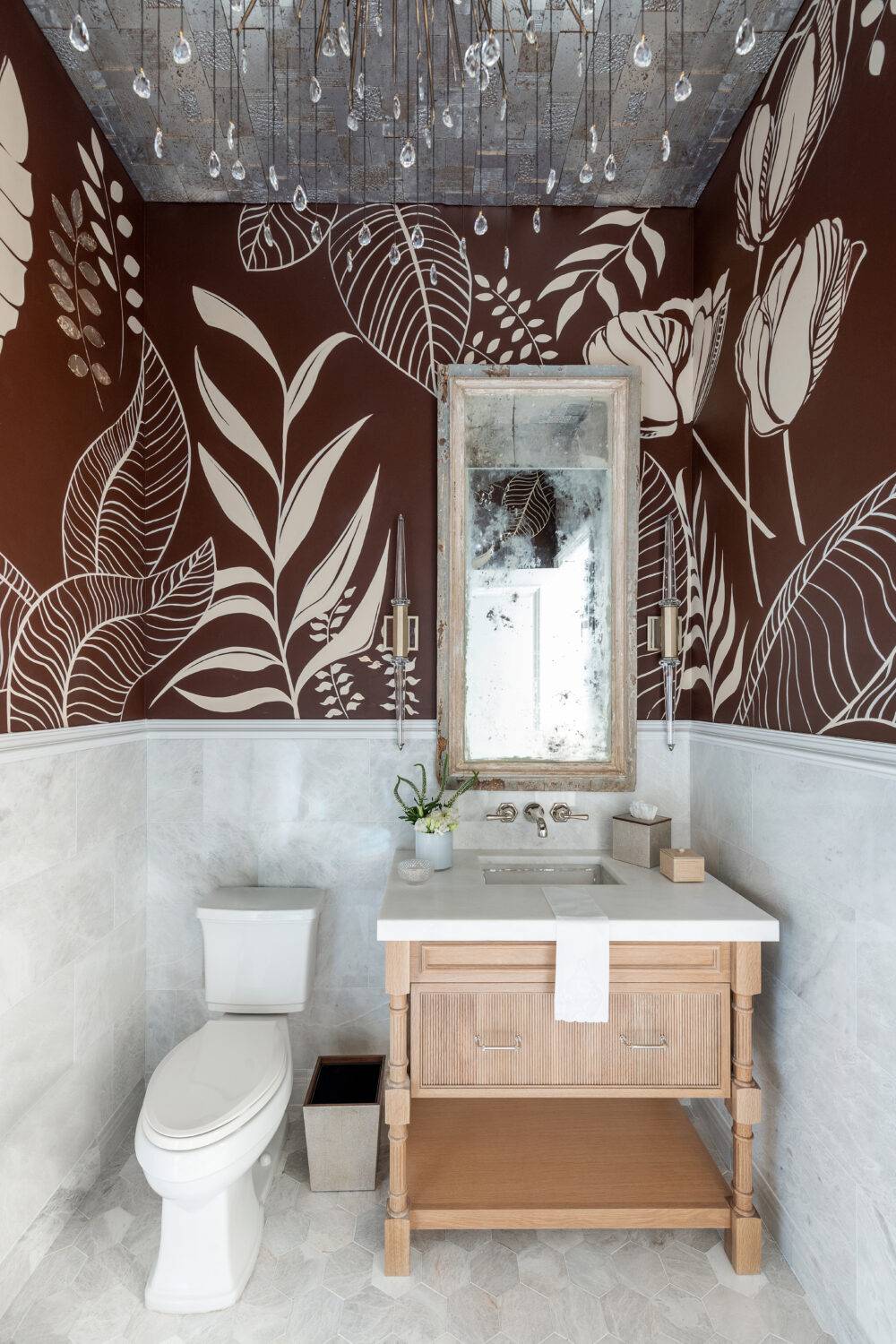 A wealth of beautiful textures and patterns meld to create intrigue and allure in this bold, yet pleasing powder room. The sculptural Harmony Silverleaf tile adds visual interest to the ceiling and complements the hanging crystals. While the soft white Meram Blanc Carra tile center the lower-half of the room in sleek comfort that contrasts the large floral wallpaper.